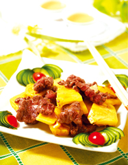牛肉250克,菠萝300克,葱1根,料酒15毫升,鲜能生抽、食用油各10毫升,生姜粉5克,淀粉15克,糖、盐、胡椒粉各适量。