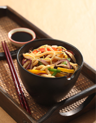 乌东面160克,洋葱丝20克,香菇丝20克,红绿菜椒丝各15克,蒜1瓣,鸡蛋1枚,油30毫升,海天味极鲜酱油20毫升,海天金标蚝油8克,鸡粉2克。